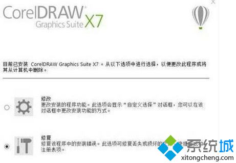 3、找到coreldraw x7,点击鼠标右键,打开卸载,在卸载界面,选中【修复】,打开下一步;