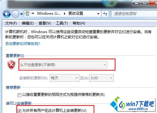 4、选择“从不检查更新”,并去掉“允许所有计算机用户安装更新”选中状态。确定即可,并重新启动看是否能顺利进入。